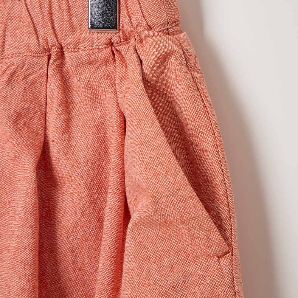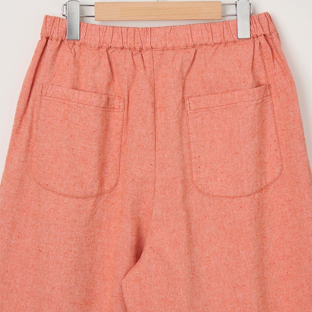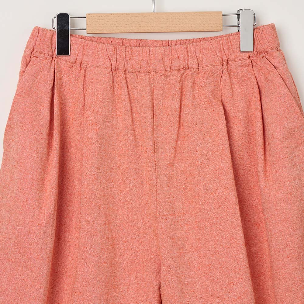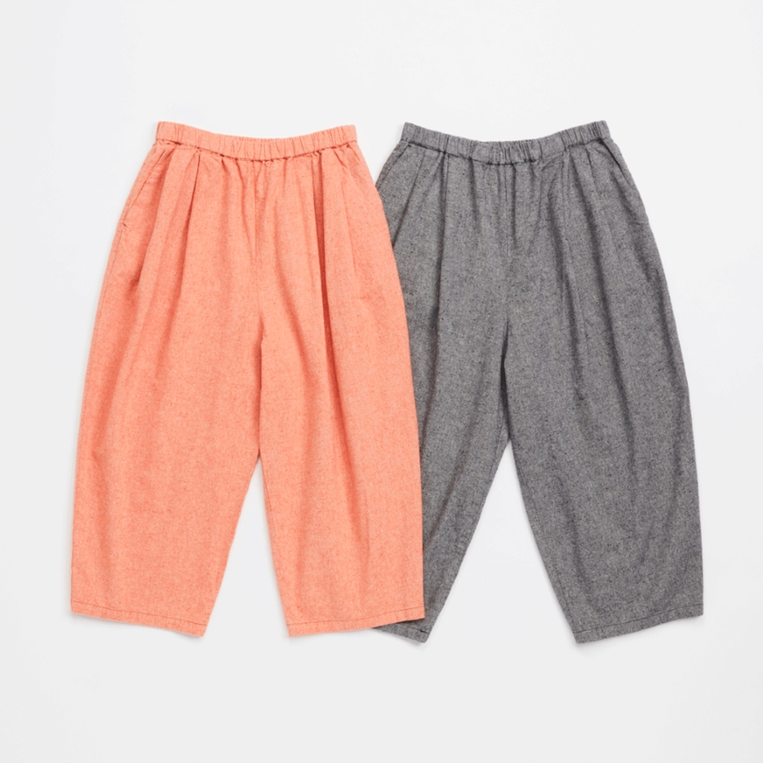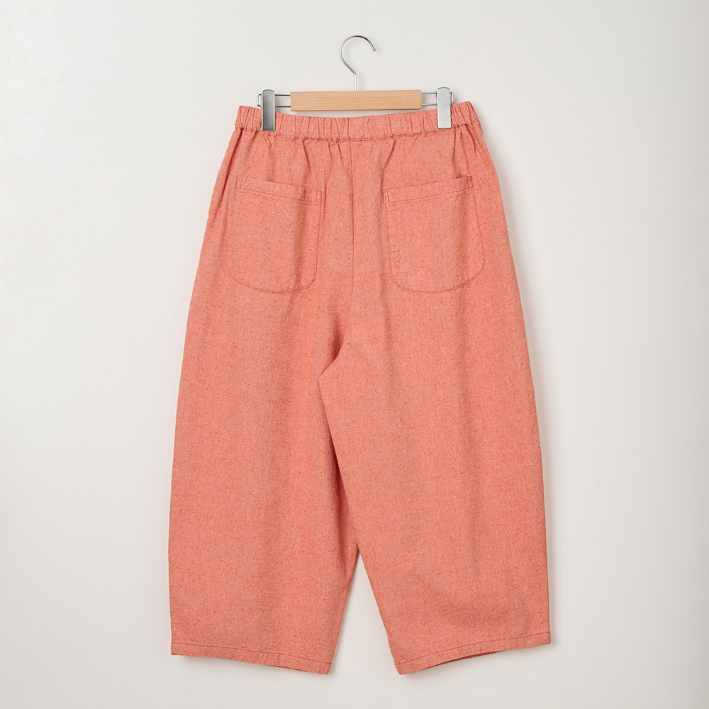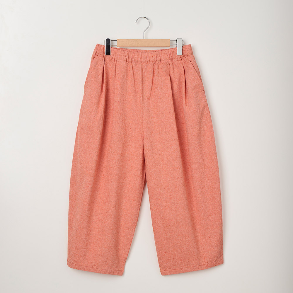 シャンブレーにネップが入った表情豊かな素材のコクーンパンツです。キナリの糸に濃色のネップ糸を交織したムラ感が特徴です。