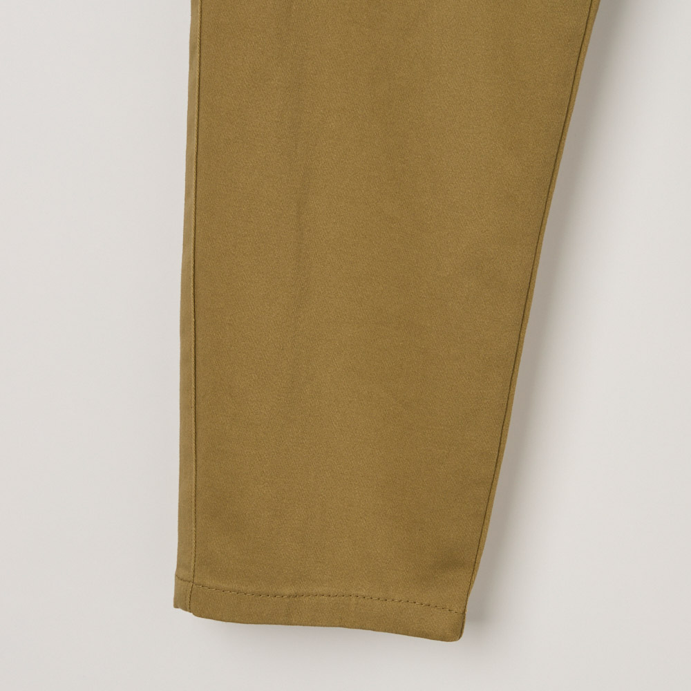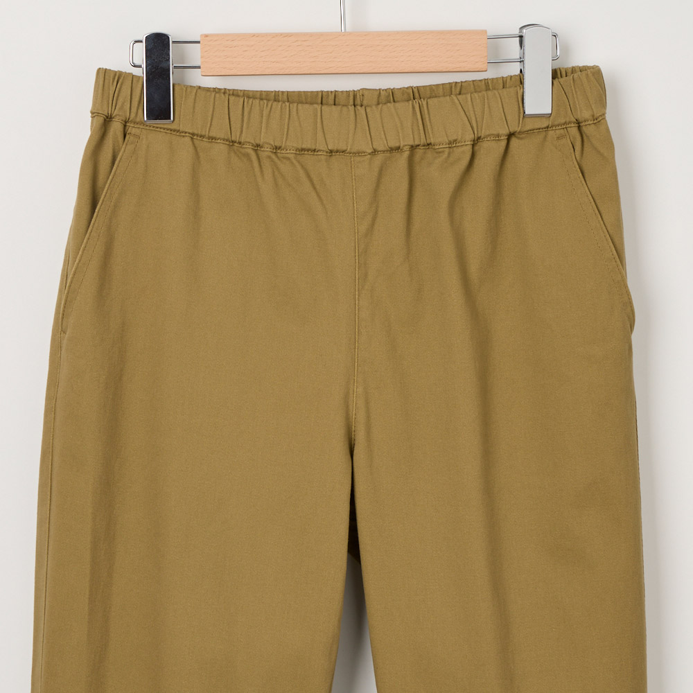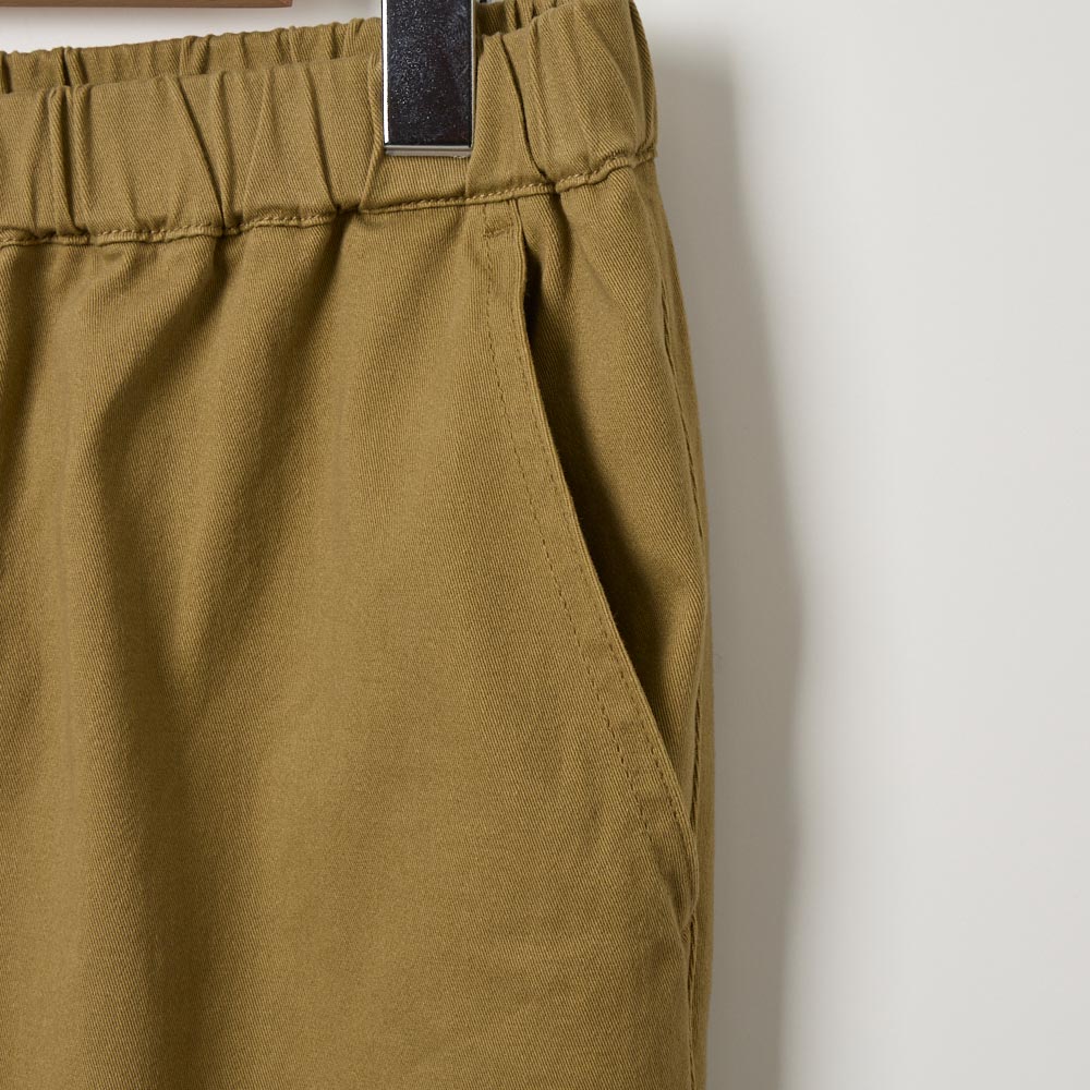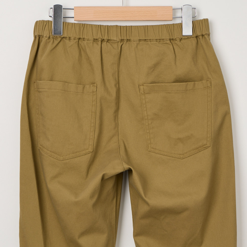 裾に向かって細くスッキリとした穿きやすい定番のシルエットです。ウエストは総ゴムで内側の紐で調節できます。